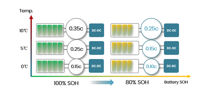 Normalmente, la potencia de carga se basa solo en la temperatura, pero esto puede no ser suficiente para evitar sobrecargas. El Estado de Salud (SOH) de la batería es un factor que también puede influir.